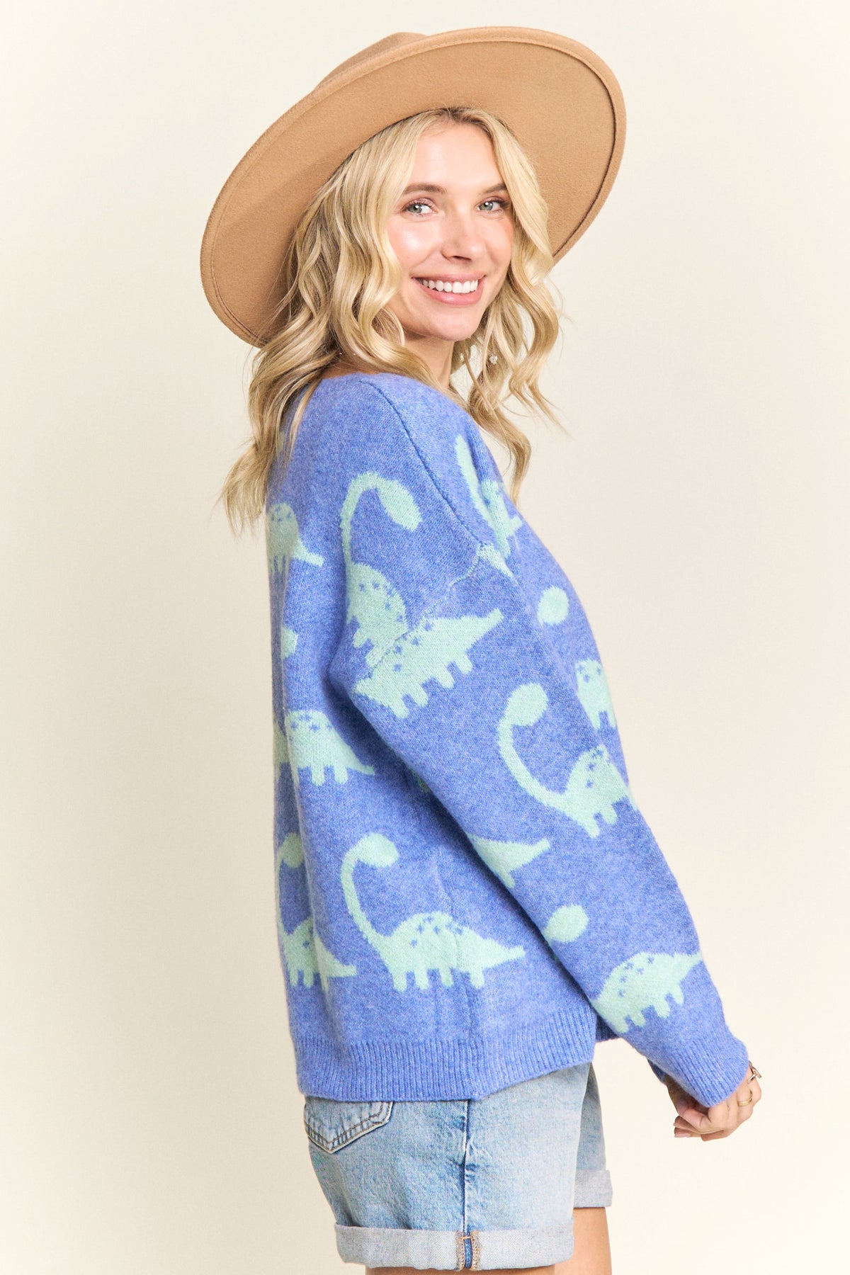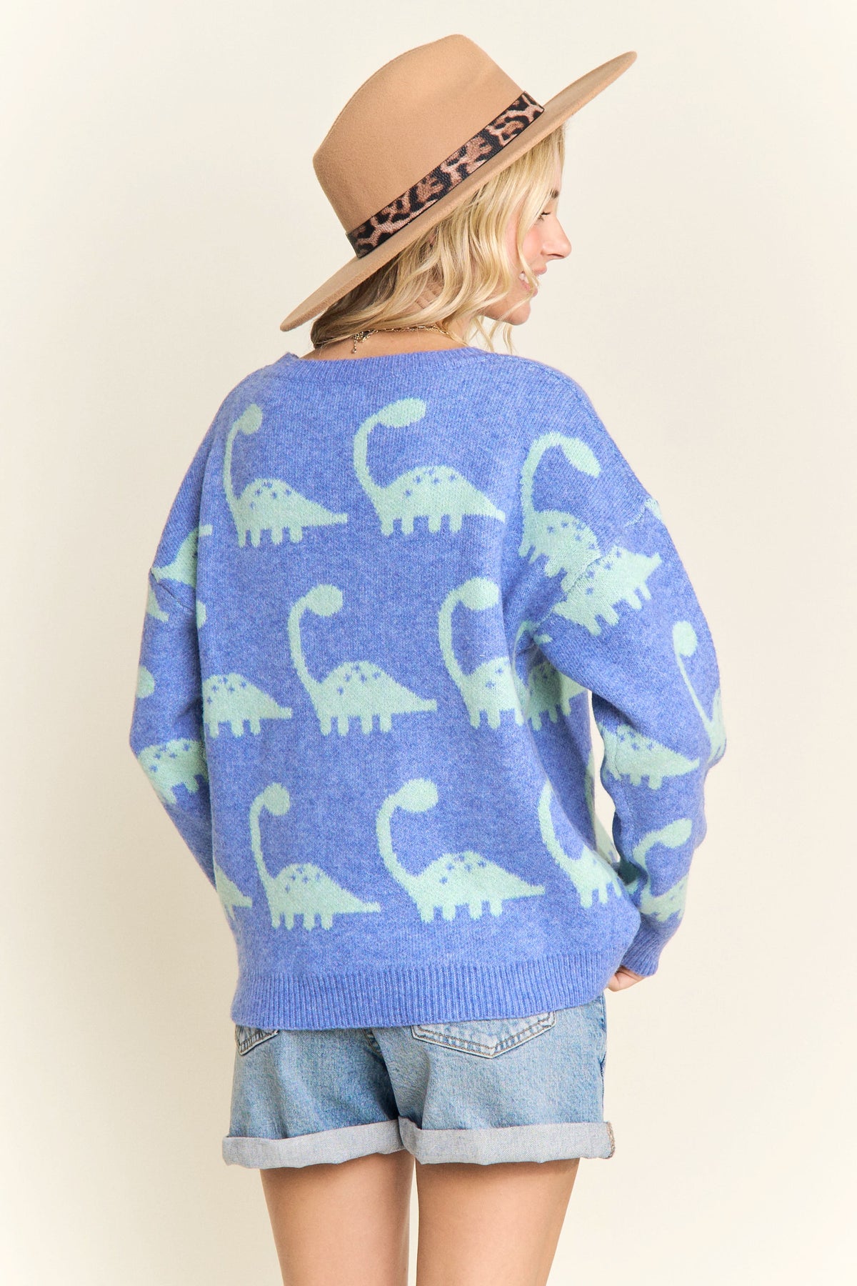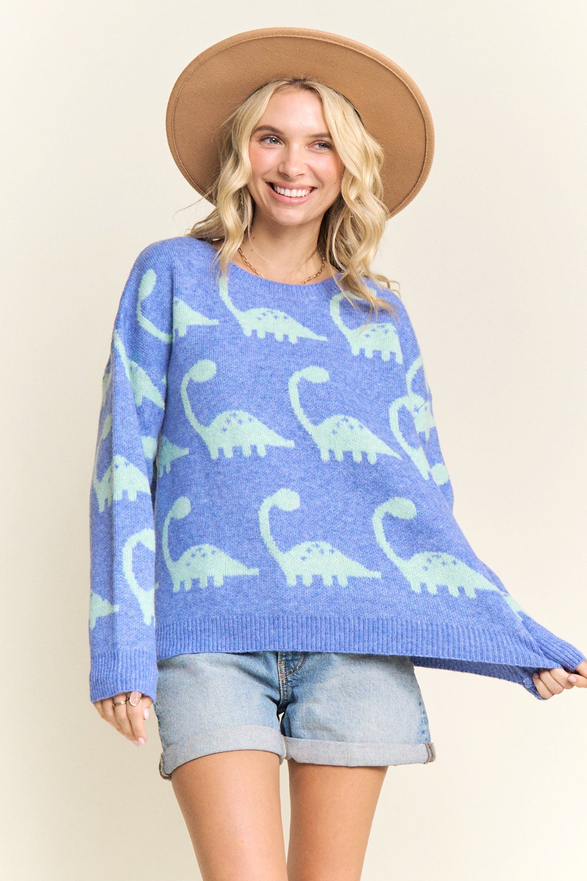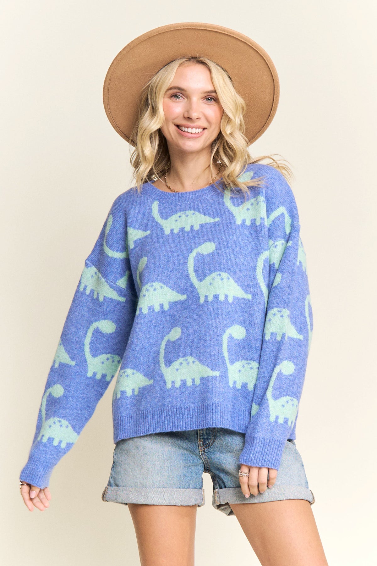 Add a dose of playful charm to your cozy-weather wardrobe with this adorable blue dinosaur sweater! Featuring a soft, fuzzy knit and an allover white brontosaurus pattern, this sweater brings a fun twist to your everyday look. The relaxed fit and ribbed edges make it effortlessly comfy—perfect for lounging at home, layering with your favorite denim, or adding a bit of whimsy to your weekend outfits.